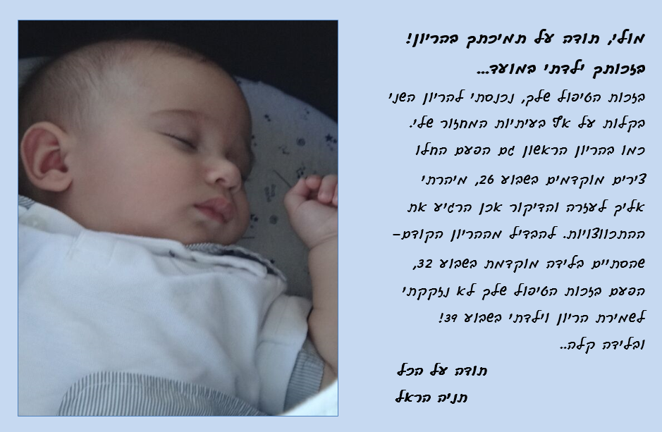 מולי תודה על תמיכתך בהריון שעזרה להרגיע את הצירים המוקדמים וללדת במועד..